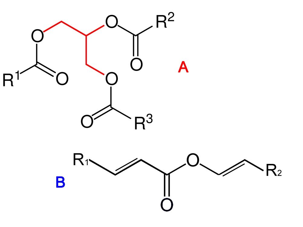 Während aber die Öle anderer Pflanzen aus Triglyceriden zusammengesetzt sind, sind es beim Jojobaöl einfache Ester langkettiger, einfach ungesättigter Fettsäuren. Diese Fettsäuren haben mehrere Besonderheiten. Zum einen die vergleichsweise lange Kohlenstoffkette und uzum anderen eine Doppelbindung in omega-9 Position: Eicos-11-enonsäure (C20), Docos-13-enonsäure (C22) und Tetracos-15-enonsäure (C 24). Diese drei Säuren liegen zu 71,3, 13,6 bzw 1,3 Prozent vor.